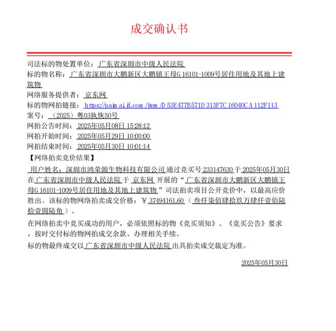 但最终仅有深圳市鸿荣源生物科技有限公司一家报名竞拍,并以起拍价成功拿下。